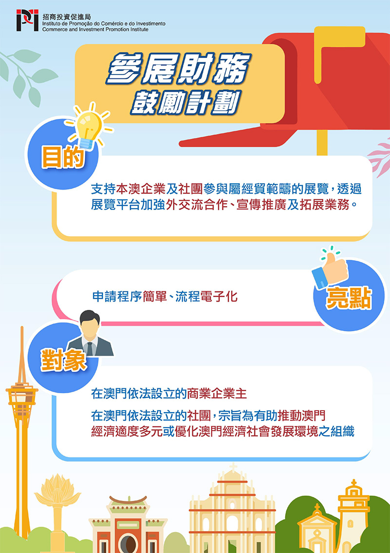 本计划旨在资助在澳门依法设立的商业企业主及非牟利社团参与属经贸范畴的展览,透过展览平台加强外交流合作、宣传推广及拓展业务。